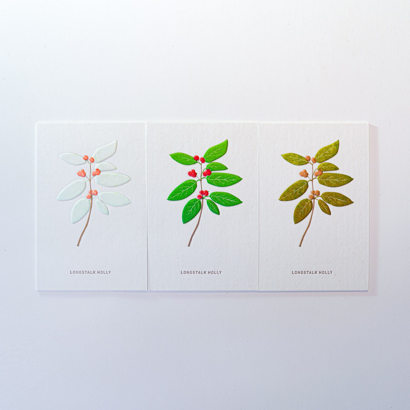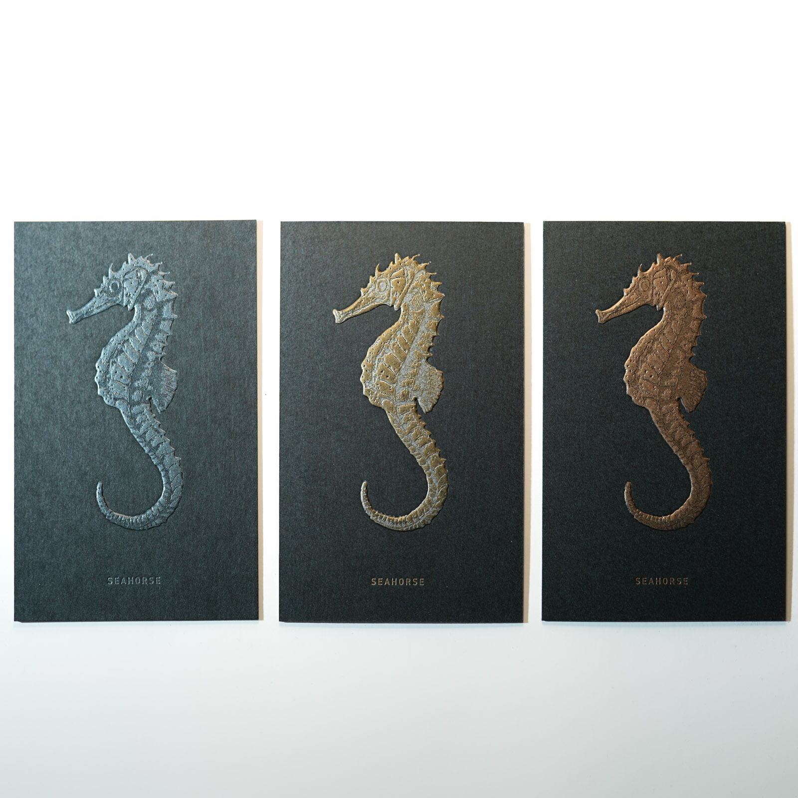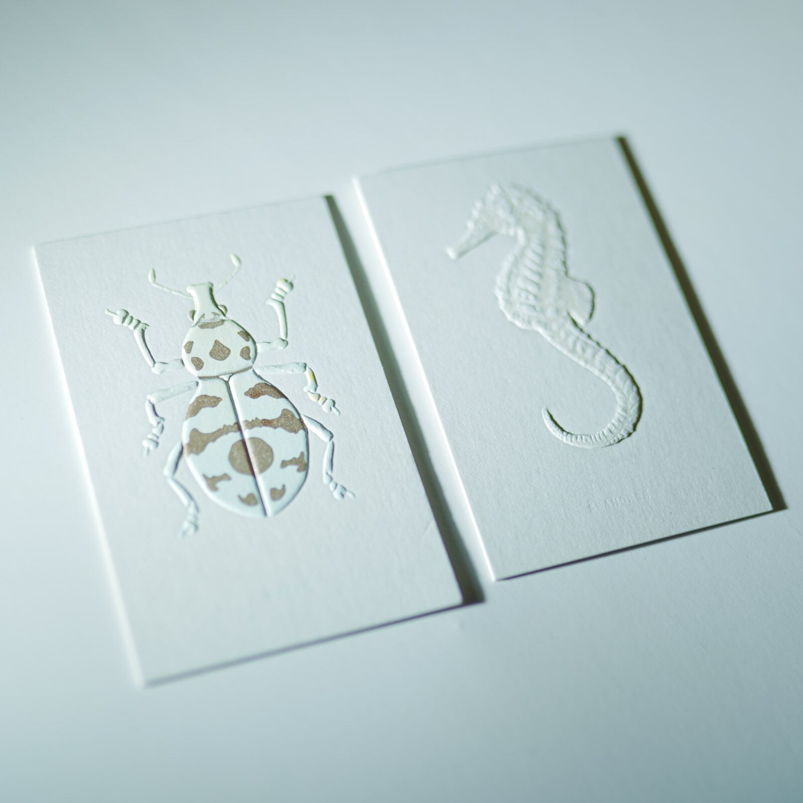 This set of eight cards is the first in ALCard's "Natural History Art" series, which uses three-dimensional letterpress and special letterpress printing techniques to create intricate patterns in the bulges and dents.